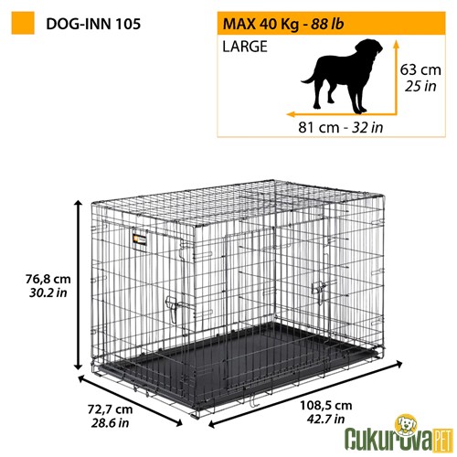 Ferplast Dog-in 105 Metal Köpek Taşıma Kafesi - Çiti 108 x 72 x 76 cm, büyük ırk köpekler için tasarlanmış sağlam ve geniş bir taşıma kafesidir. Ev içi kullanımın yanı sıra seyahatlerde de köpeğinizin güvenle konaklamasını sağlar. Geniş metal ızgaraları sayesinde hava dolaşımını maksimum seviyede tutar ve ferah bir ortam sunar. Katlanabilir yapısı sayesinde kullanılmadığında kolayca depolanabilir.