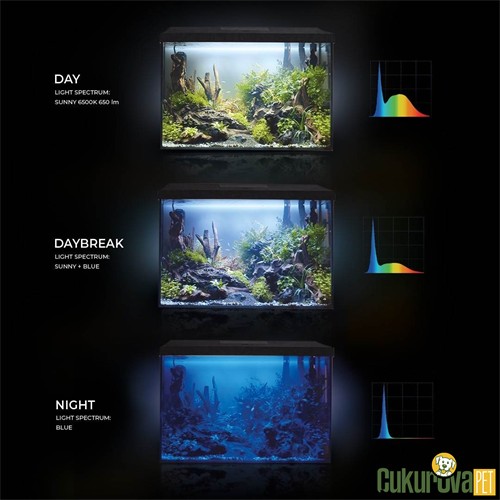Aydınlatma modunun gündüz veya gece olarak tercih edilmesi, akvaryumda bulunan canlıların doğal ritimlerine uygun bir ışık ortamı oluşturulmasına katkı sağlar.