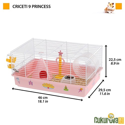 Ferplast Criceti 9 Princess prenses temalı kemirgen kafesi, 46x29.5x23 cm ölçüleriyle hamsterlar için eğlenceli, renkli ve konforlu bir yaşam alanı sunar.