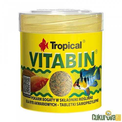 Vitabin, küçük otçul ve dipte yaşayan balıkların günlük beslenmesi için tasarlanmış, kendinden yapışkanlı tablet formunda temel, bitki bazlı bir yemdir. Büyüyen yavru balıklar ve omnivor balıklar için mükemmel bir takviyedir. Yemde bulunan stabilize C vitamini, bağışıklık sistemini güçlendirerek balığın patojenlere karşı savunmasını destekler. Yüksek lif içeriği, otçul balıkların uzun sindirim sisteminin düzgün çalışmasını sağlar ve düzenli olarak Vitabin tabletleriyle beslenen balıklar kabızlığa ve tehlikeli gastrointestinal iltihaplanmaya yatkın olmazlar. Otçul balıklar için temel yem ve omnivor balıklar için takviye yemdir. Lif, sindirim fonksiyonunu düzenler ve kabızlığı önler. C vitamini bağışıklığı artırır. Optimum dengeli yem bileşimi, vitaminler ve eser elementler, balığın doğru büyüme ve gelişmesini sağlar.