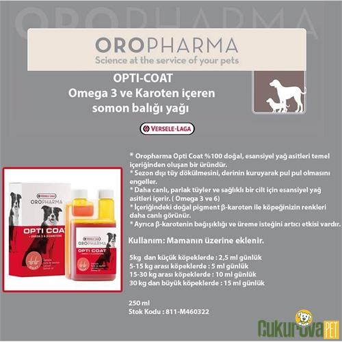 Versele Laga Oropharma Opti Coat, yüzde yüz doğal somon balığı içeriğinde oluşan bir üründür. Yavru yaştan yetişkin yaşa kadar her ırktan köpek için uyumludur. İçeriğindeki omega 3, keratin sayesinde tüy dökme dönemlerinde ve dönem dışında kullanılması önerilir. Hassas cilde sahip köpekler de derinin kuruyup pul pul dökülmesi Versele Laga Oropharma Opti Coat sayesinde önlenmiş olur.