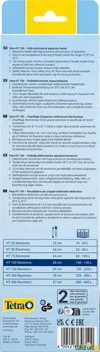 Tetra HT 100 W Akvaryum Isıtıcısı, küçük ve orta hacimli akvaryumlarda su sıcaklığını güvenilir ve hassas şekilde sabit tutmak için tasarlanmış elektronik kontrollü bir akvaryum ısıtıcısıdır. Entegre mikroişlemci teknolojisi sayesinde su sıcaklığını sürekli izler ve ayarlanan değerde stabil şekilde korur. 20–32 °C arasında ayarlanabilen sıcaklık aralığı, tropikal balıklar ve diğer akvaryum canlıları için ideal bir yaşam ortamı oluşturur. Dayanıklı borosilikat cam tüp ve koruyucu plastik kaplama sayesinde darbelere karşı dayanıklıdır ve uzun süre güvenli kullanım sağlar.