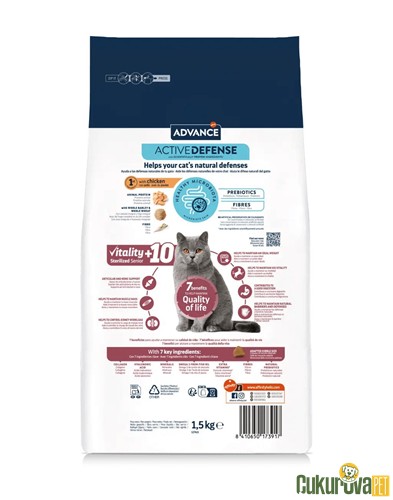 Advance Vitality+10 Sterilised Tavuklu Yaşlı Kedi Maması 1.5 Kg, 10 yaş ve üzeri kısırlaştırılmış kedilerin değişen metabolizma, eklem, bağışıklık ve kilo kontrolü ihtiyaçlarına göre özel olarak formüle edilmiş premium bir mamadır. Düşük yağ oranı ile sağlıklı kilo yönetimi sunarken, kolay sindirilebilir tavuk proteini yaşlı kedilerin kas kütlesinin korunmasına yardımcı olur. Antioksidanlar, Omega yağ asitleri ve eklem destekleyici bileşenler (glukozamin - kondroitin) ile yaşlılık etkilerine karşı kapsamlı destek sağlar. Böbrek sağlığını korumaya yardımcı optimize edilmiş mineral dengesi sayesinde uzun vadeli yaşam kalitesini artırmayı hedefler.