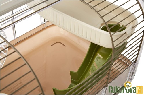 Şeffaf plastik gövde, dayanıklı üst havalandırma ızgarası, geniş ön kapak, egzersiz çarkı, mama kabı, su şişesi, tünel bağlantı girişleri.