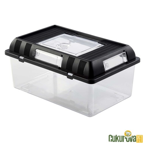 Exo Terra Breeding Box Medium sürüngen ve amfibiler için taşıma geçici barındırma besleme ve yavru büyütme amacıyla kullanılan orta boy dayanıklı plastik kutudur Üstten açılır özel kapak sistemi sayesinde hayvanı kaçırmadan güvenli bakım ve besleme yapılmasını sağlar Havalandırma kanalları ile yeterli hava akışı sunar.