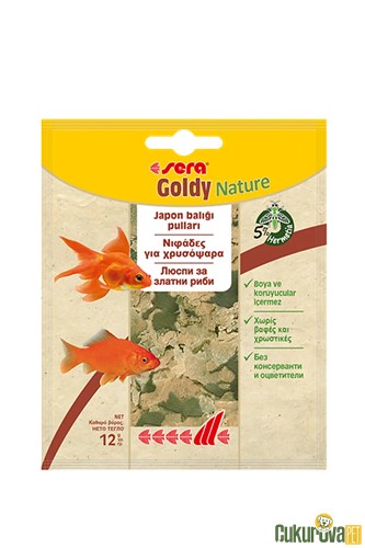 Sera Goldy Nature, boya ve koruyucu madde içermeyen “Nature” serisi pul yemdir; özellikle küçük ve orta boy Japon balıkları (örneğin shubunkin, veiltail, sarasa) ile diğer soğuk su balıkları için günlük temel besin olarak geliştirilmiştir. Dengeli bitkisel ve hayvansal içerikler sayesinde sağlıklı büyüme, canlı renkler ve kolay sindirim sunar; pullar suda şeklini korur ve suyu bulandırmaz.
