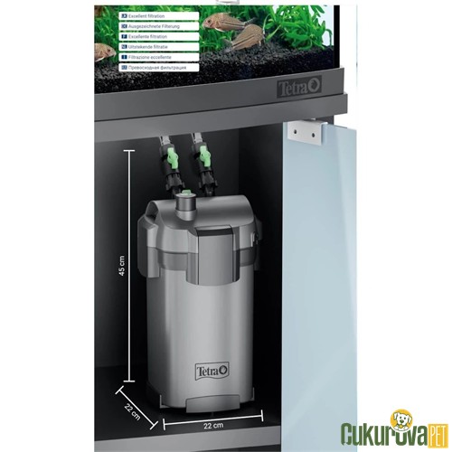 100-300 litrelik akvaryumlar için uygun dış filtre. Tetra marka dış filtreler filtre malzemeleri ile birlikte kuruluma hazır olarak gelmektedir.
